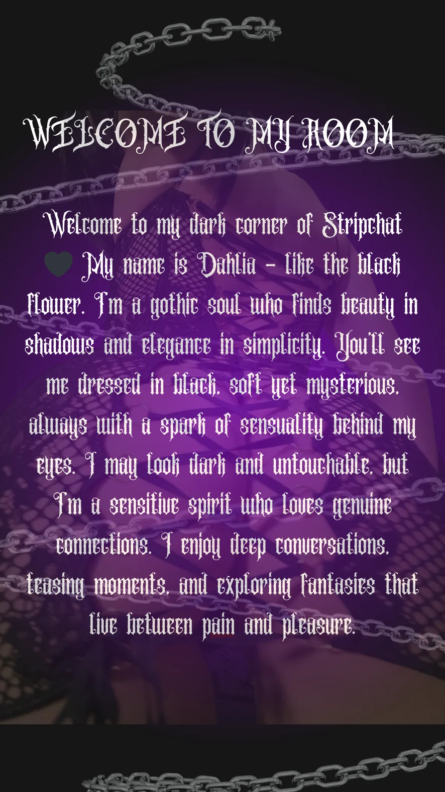 Welcome to my dark corner of Stripchat 🖤 My name is Dahlia – like the black flower. I’m a gothic soul who finds beauty in shadows and elegance in simplicity. You’ll see me dressed in black, soft yet mysterious, always with a spark of sensuality behind my eyes. I may look dark and untouchable, but I’m a sensitive spirit who loves genuine connections. I enjoy deep conversations, teasing moments, and exploring fantasies that live between pain and pleasure. Step into my world… I’ll show you how sweet darkness can be. 🌑